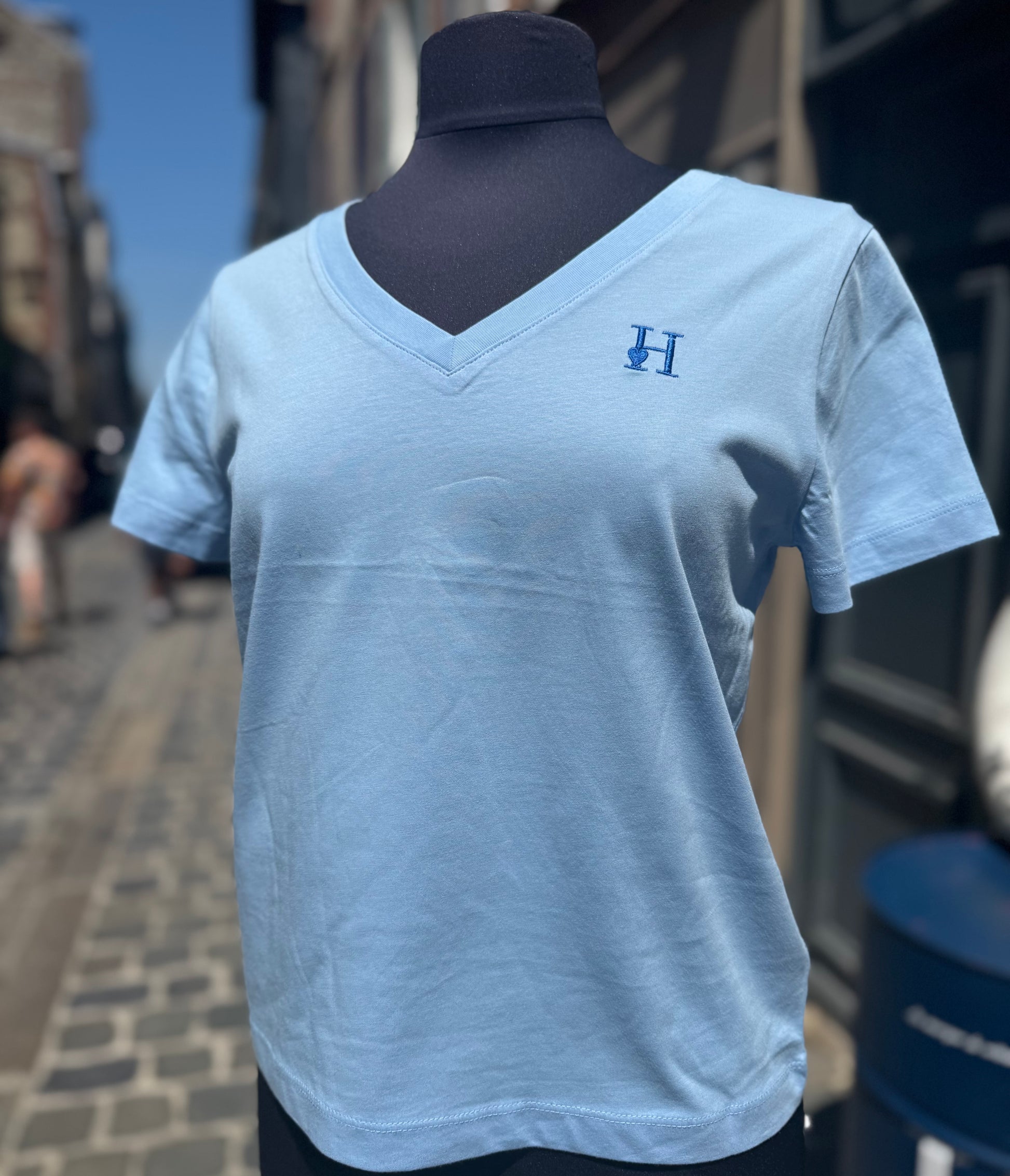 T-shirt col V couleur bleu ciel avec H brodé au cœur.