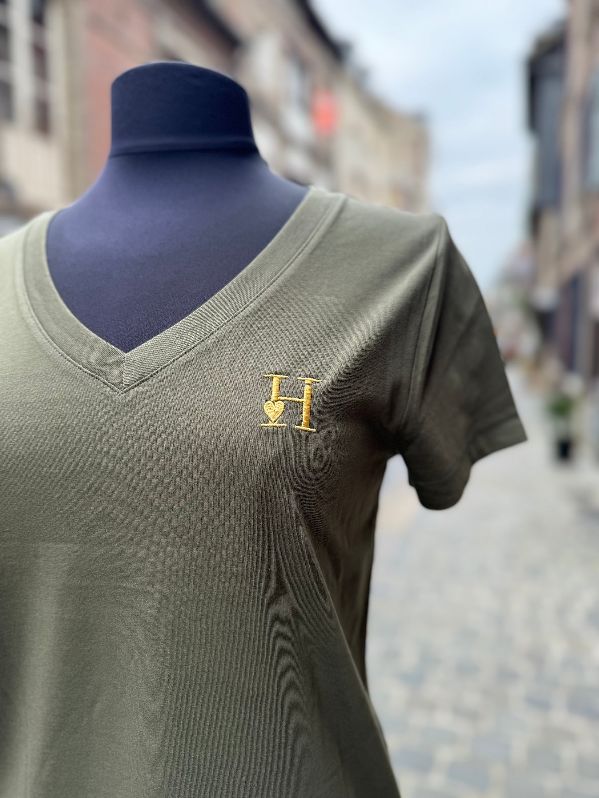 T-shirt col V couleur kaki avec H brodé au cœur en jaune pâle.